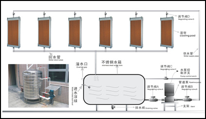 1、“濕簾-負壓風機”降溫系統是由紙質多孔濕簾、水循環系統、風扇組成。未飽和的空氣流經多孔、濕潤的濕簾表面時,大量水分蒸發,空氣中由溫度體現的顯熱轉化為蒸發潛熱,從而降低空氣自身的溫度。風扇抽風時將經過濕簾降溫的冷空氣源源不斷的引入室內,從而達到降溫效果。