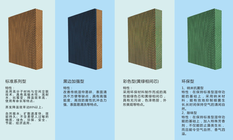 綠色濕簾型號:5060/5090/7060/7090 優質濕簾還不含易使皮膚過敏的苯酚等化學物質,安裝使用時對人體無毒無害,綠色、安全、節能、環保、經濟。